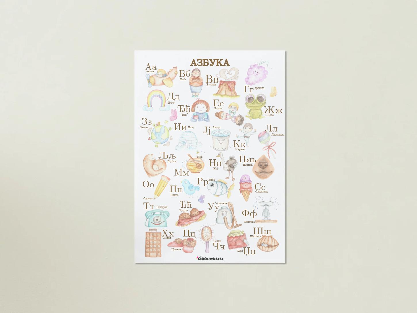 Each letter of the Serbian Cyrillic alphabet is paired with a vibrant hand-painted watercolour illustration. From familiar animals and favourite foods like honey, grapes, and yogurt, to everyday objects such as shoes, pencils, and telephones. These relatable images help children connect letters to real-life words, making language learning natural and fun.